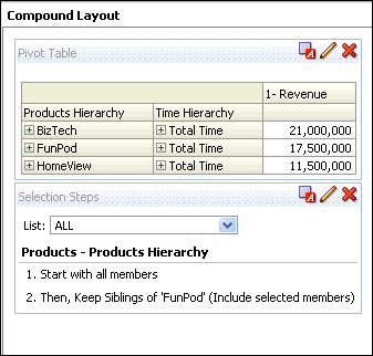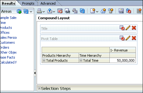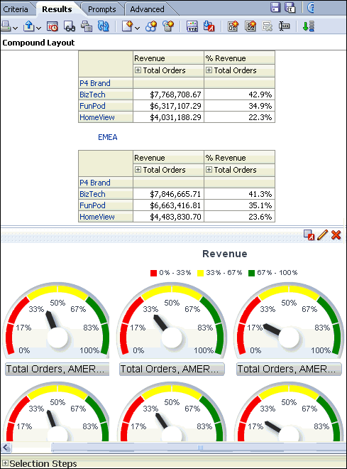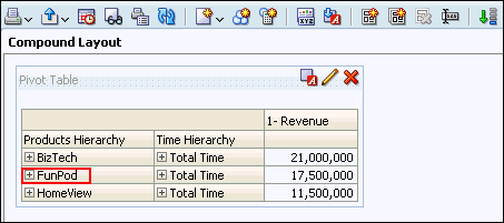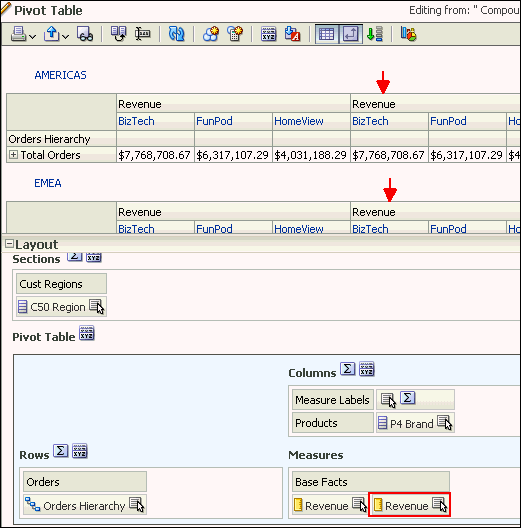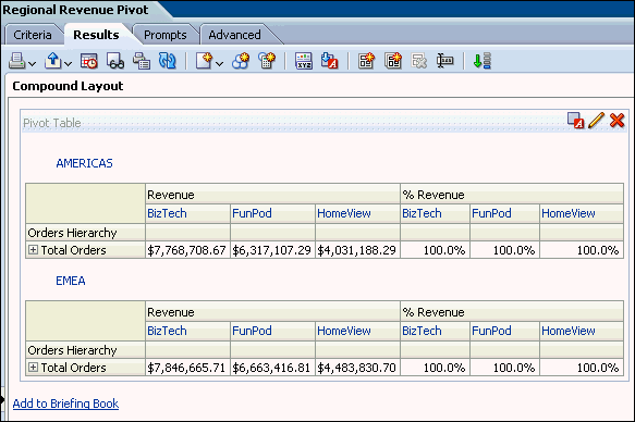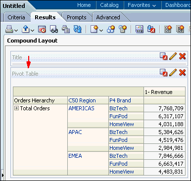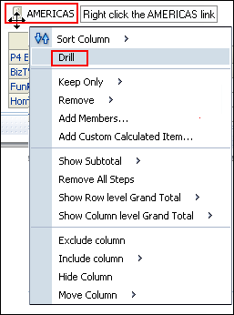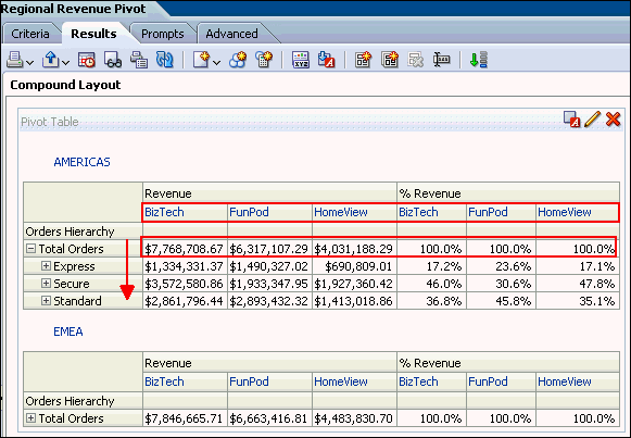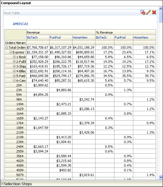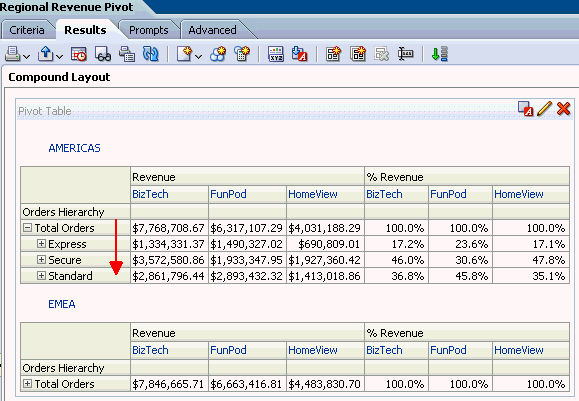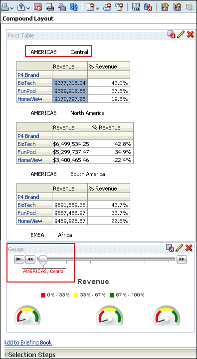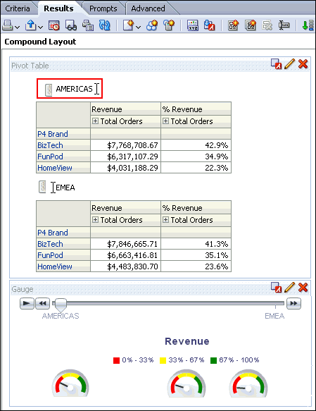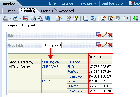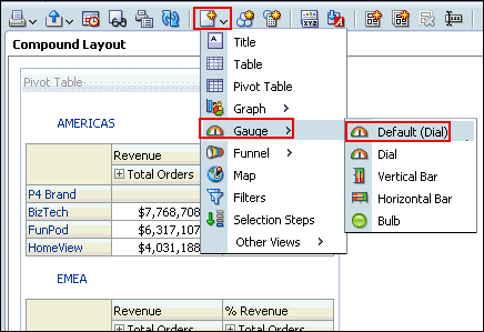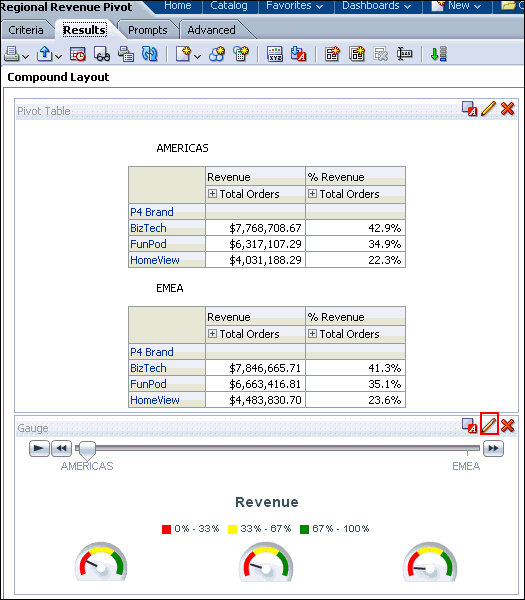 a. In the Pivot Table view (the master view), select AMERICAS to drill down.![]() ![]() Both the Pivot Table view and the Gauge view (the detail view) update to reflect the drill. ![]() b. Save your analysis. Sources www.oracle.com manual |