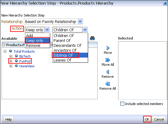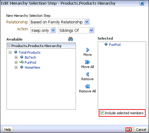 | 7 . | The New Hierarchy Selection Step dialog box expands. Select “ Keep only”, “Siblings Of” as the action, and then expand Total Products and select FunPod. Move FunPod to the Selected pane. ![]() Click OK. |