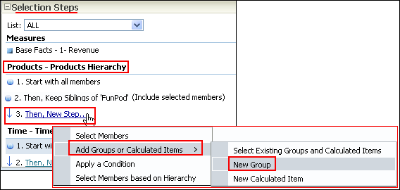 | 12 . | Now, you will add a Group for Products Hierarchy. In the Product – Product Hierarchy section, click “Then, New Step.” ![]() Select Add Groups or Calculated Items > New Group. |