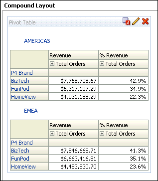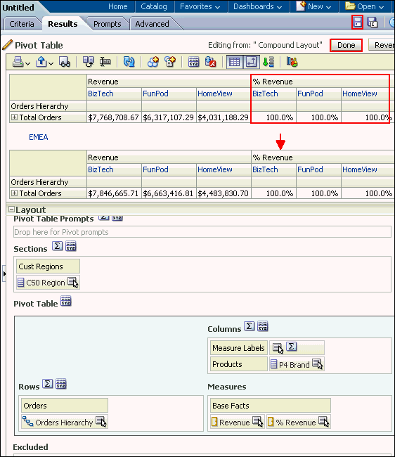 As > Percent of > Row Parent.![]() The Pivot Table editor looks like this: ![]() Click Done and save the analysis as Regional Revenue Pivot. The pivot table should look like this: ![]() |
