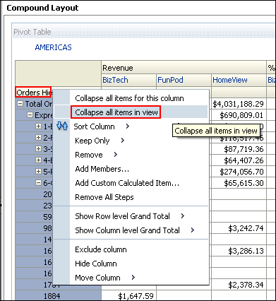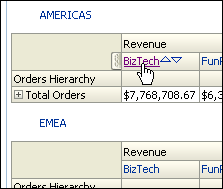 Revenue is the measure.![]() Because hierarchical columns imply pivot tables, you can sort not only on members and measures, but also on rows. Hierarchical members on the row edge can include sort carat icons ( When you sort members in a hierarchical column, you always sort within the parent; that is, children are never sorted outside of their parent. The children appear below the parent in the proper sort order; the parent is not sorted within its children. b. The Total Orders parent member represents an outline total for the orders. Row sort Total Orders, for the Americas in Descending sequence and examine the results within the pivot table. The product brands on the column edge are sorted, reflecting sorted Revenue values in descending sequence for each Total Order. ![]() |