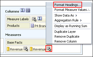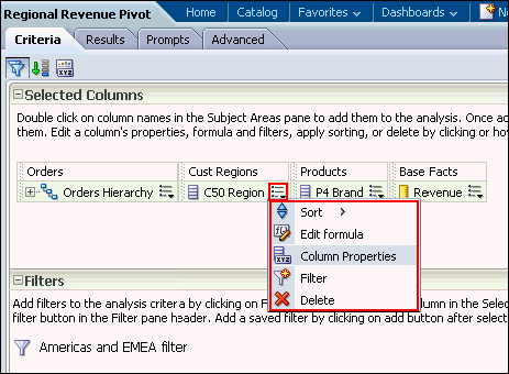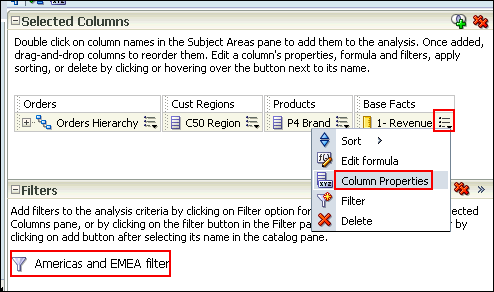 | 4 . | a. Return to the Criteria tabbed page. b. Apply the Americas and EMEA filter named filter as you did previously. c. Edit the column properties for Revenue. Click the More Options icon for 1 - Revenue and select Column Properties. ![]() The Column Properties dialog box appears. |