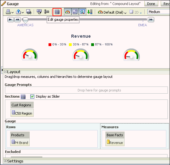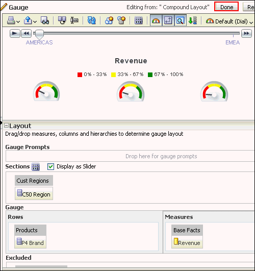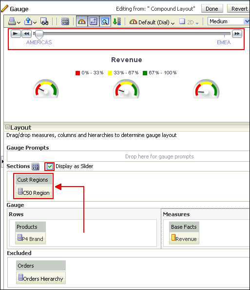 | 4 . | Add a slider to the gauge (for C50 Region). In the Layout pane, drag C50 Region to the Sections drop target and select Display as Slider. ![]() Click Done and save the analysis. |