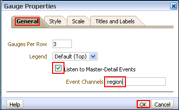 | 5 . | The Gauge Properties dialog box appears.![]() a. Select the Listen to Master-Detail Events check box. b. Enter region in the Event Channels text box. Remember that this must match precisely with the text entered for the master view. c. Click OK. |